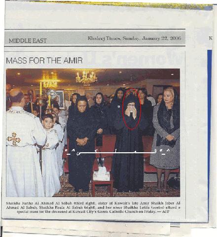 الشيخه فريحه الاحمد الصباح (الثالثه من اليمين) , شقيقه امير الكويت الراحل الشيخ جابر الاحمد الصباح , الشيخه بولا الصباح (يمين) , وعمتها\خالتها الشيخه لطيفه (في الوسط).. يحضرون صلاه خاصه للراحل الشيخ جابر في الكنيسه الكاثوليكيه في مدينه الكويت ..